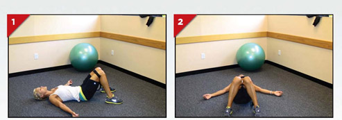 Lie on back with knees bent, feet flat and shoulder-width apart. Draw-in belly button and squeeze butt muscles. Lift pelvis off floor until knees, hips and shoulders are in line, pushing through heels. Lower pelvis to floor.