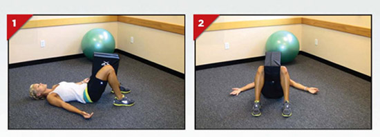 Lie on your back with the knees bent and in line with the hips. Feet flat on the floor and pointing straight ahead. Place a 6” pillow or as yoga block between the knees. Using the inner thighs, squeeze and release using both knees evenly. Only use about 70% of your maximum effort. (3 sets of 20 repetitions)