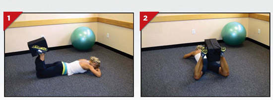 Lie on your stomach, palms down and chin resting on the hands. Place a 6” pillow between the ankles. Bend the knees while still holding the pillow to a 90 degree angle. Squeeze and release the pillow using only the ankles. You should feel a contraction in the buttocks. If not continue widening the knees until the deep glute muscles activate. (2 x 20)