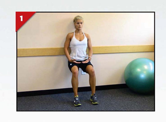 Standing against a wall, feet shoulder width apart, move feet out in front of you to allow you to squat to a 90 degree angle. Press the small of your back and hips into the wall and relax the upper body. Be sure the knees are directly above the ankles, not the toes. If there is pain in the knees, raise the body up the wall to relieve the pressure off the knees. Walk around for a minute following this exercise. (1:00)